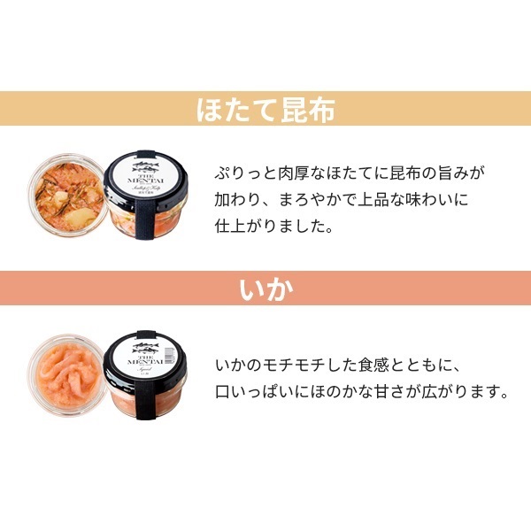 喜こんぶめんたい三昧[無着色](240g)、THE MENTAI[ほたて昆布・いか](各40g) ※めんたいはグラム換算になっておりますので、本数は写真と異なる場合がございます。 |