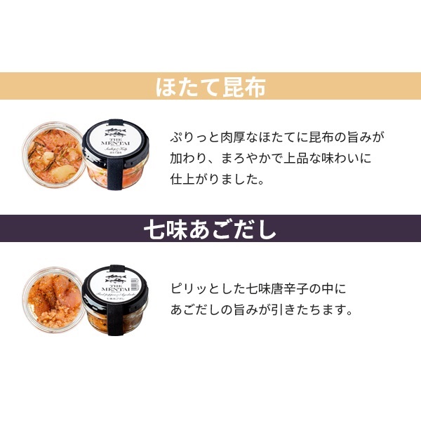季節限定の和え物「THE MENTAI ほたて昆布」と大人気の「THE MENTAI 七味あごだし」をセットした、2種類の味が楽しめるTHE MENTAIシリーズのギフト。誕生や合格、節目のお慶びに活躍します。