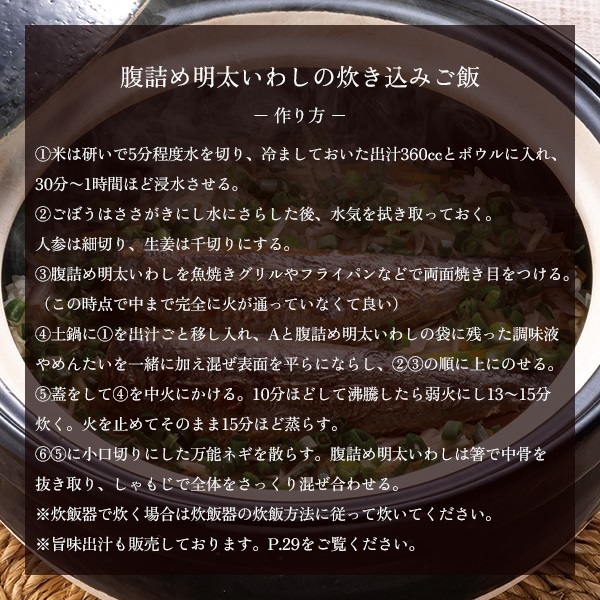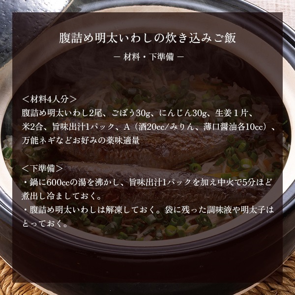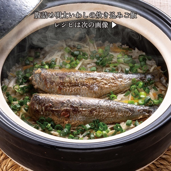 国産いわしを丁寧に開き、お腹の中に明太子を贅沢に詰めました。皮目がパリッとするまでじっくり焼くことで、いわしの脂と明太子の旨味をお楽しみいただけます。