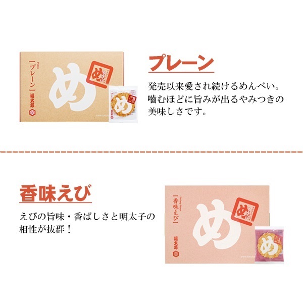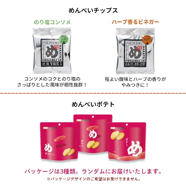 めんべい[プレーン](2枚×16袋)、めんべい[香味えび・明太バター風味](各2枚×12袋)、めんべい[辛口](2枚×8袋)、めんべいチップス[のり塩コンソメ・ハーブ香るビネガー](各25g)、めんべいポテト(40g)