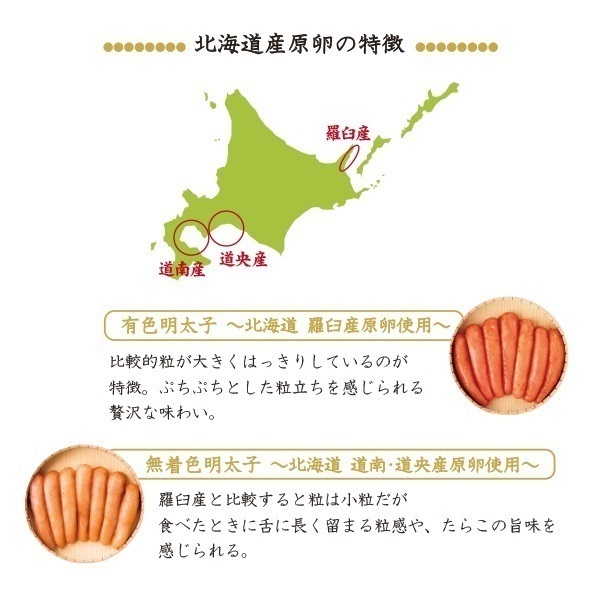 数量限定!北海道羅臼産原卵使用の有色明太子と北海道道南・道央産原卵使用の無着色明太子の詰め合わせ。