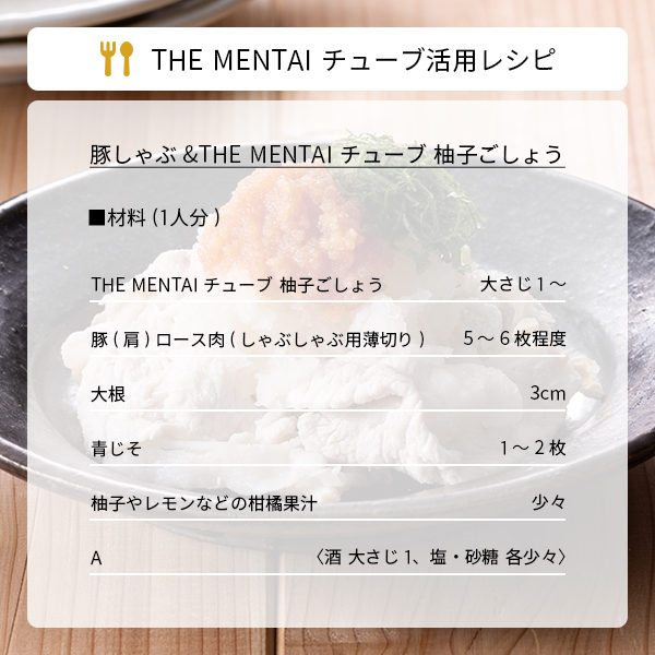 すけとうだらの卵巣(日本又はロシア又はアメリカ(5%未満))、柚子胡椒、食塩、醸造調味料、みりん、唐辛子、たん白加水分解物、かつお節エキス、魚醤調味料/甘味料(ソルビット、ステビア、カンゾウ)、調味料(アミノ酸等)、トレハロース、酸化防止剤(ビタミンC)、pH調整剤、ナイアシン、着色料(赤102、黄5、赤3、アナトー)、発色剤(亜硝酸Na)、酵素、(一部に大豆を含む) |