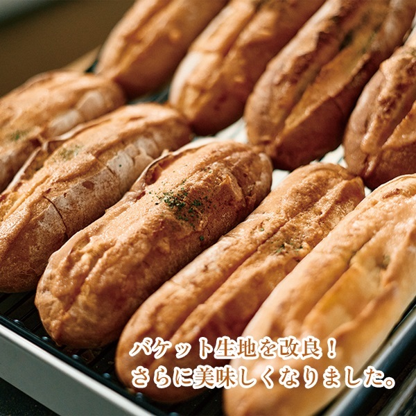 福太郎独自の明太子フィリングを贅沢にたっぷり挟み込み、自社のパン工房で焼き上げました。外はパリッ、中はもっちりとした福太郎オリジナルのめんたいフランスです。基本のプレーン味にバジルソースをトッピングしました。爽やかなバジルの香りが食欲をそそる一品です。