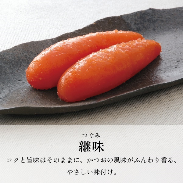 好味[有色・無着色](各100g)、継味[有色](100g) ※めんたいはグラム換算になっておりますので、本数は写真と異なる場合がございます。 |