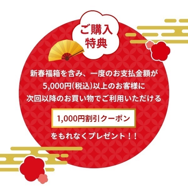 新春福箱を含み、一度のお支払金額が5,000円(税込)以上のお客様に、次回以降のお買い物でご利用いただける1,000円割引クーポンをもれなくプレゼント!!
