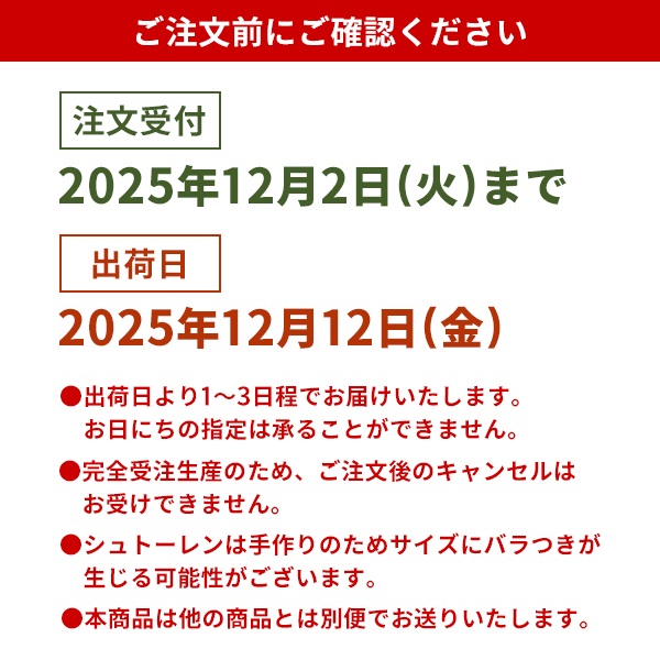 ●シュトーレンは手作りのためサイズにバラつきが生じる可能性がございます。