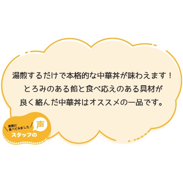 野菜(はくさい、たけのこ、にんじん、さやえんどう、ねぎ)、いか、えび、清酒、大豆油、ごま油、砂糖、食塩、魚介エキス調味料、ポークエキス調味料、香辛料、貝エキス調味料、えびエキスパウダー、きくらげ、卵白、しょうゆ、でん粉、ラー油/増粘剤(加工でん粉)、調味料(アミノ酸等)、重曹、(一部にえび・かに・小麦・卵・いか・ごま・大豆・鶏肉・豚肉を含む) |